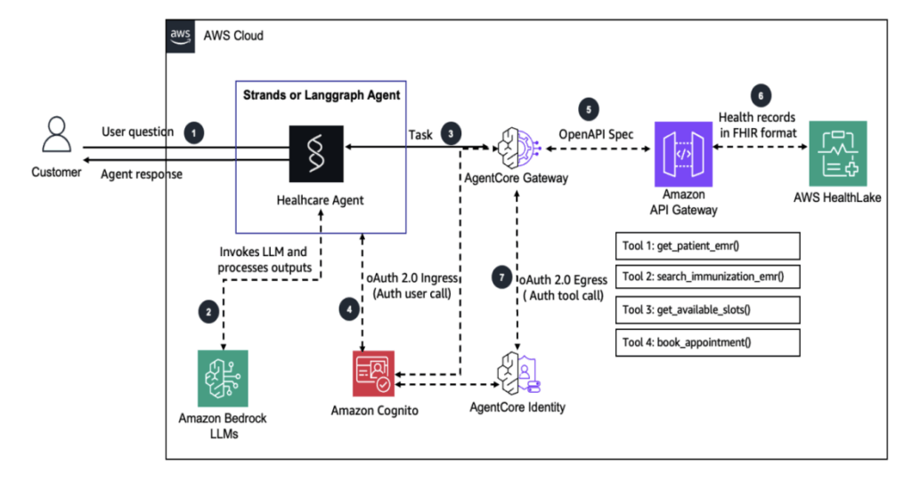 Well being care calls for precision and accountability. AI brokers working inside this area should deal with delicate affected person knowledge securely, adhere to rigorous compliance rules (like HIPAA), and preserve constant interoperability throughout various scientific workflows. Normal, generalized protocols fall quick when coping with complicated healthcare programs and affected person knowledge safety necessities. Healthcare organizations want a sturdy service to transform their current APIs into Model Context Protocol (MCP) suitable instruments that may scale successfully whereas offering built-in authentication, authorization, encryption, and complete audit trails. Amazon Bedrock AgentCore Gateway gives well being care suppliers and digital well being firms an easy and safe strategy to construct, deploy, uncover, and hook up with instruments at scale that they’ll use to create AI-powered healthcare options whereas sustaining the best requirements of safety and compliance.