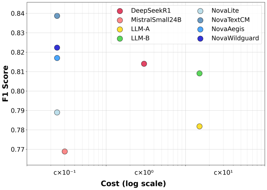 The price-performance evaluation on the WildGuard benchmark reveals compelling benefits for Nova customization you can notice in your deployments. Your Nova variants obtain superior F1 scores in comparison with industrial basis fashions whereas working within the low-cost class. For instance, NovaTextCM achieves an F1 rating of 0.83871 on WildGuard whereas working at extraordinarily low value, outperforming LLM-B’s F1 rating of 0.80911 which operates at high-cost pricing—delivering higher efficiency at considerably decrease value.