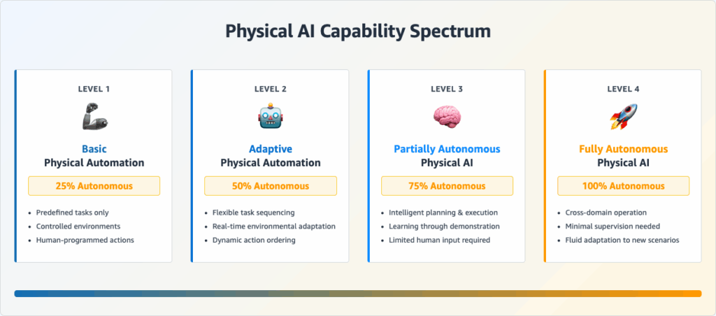- Degree 4: Absolutely Autonomous Bodily AI: Probably the most superior degree options methods able to working throughout diversified domains with minimal supervision. These methods adapt fluidly to new eventualities and environmental adjustments. Though most business options stay at Ranges 1 or 2, momentum towards full autonomy is accelerating.