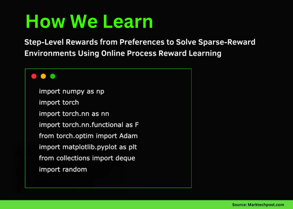On this tutorial, we discover On-line Course of Reward Studying (OPRL) and show how we are able to be taught dense, step-level reward indicators from trajectory preferences to resolve sparse-reward reinforcement studying duties. We stroll via every part, from the maze atmosphere and reward-model community to choice era, coaching loops, and analysis, whereas observing how the agent progressively improves its behaviour via on-line preference-driven shaping. By working this end-to-end implementation, we acquire a sensible understanding of how OPRL permits higher credit score task, quicker studying, and extra steady coverage optimization in difficult environments the place the agent would in any other case wrestle to find significant rewards. Take a look at the FULL CODE NOTEBOOK.